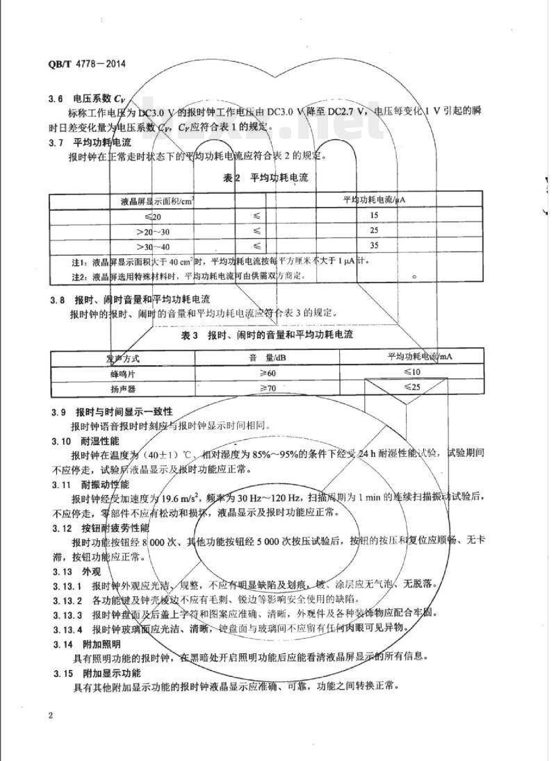 标称工作电压为DC3.0Y的报时钟工作电压由DC3.0W降至DC2.7V,电压每变化1V引起的瞬时日差变化量为电压系数v,Cv应符合表1的规定3.7平均功耗/电流