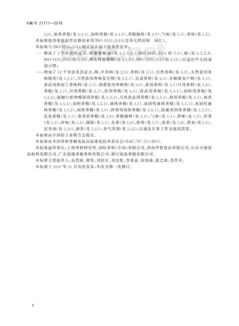 重新定义了16个术语,即:天然原料(见2.1.2007版的2.1.1)、渗出物(见2.2.2007版的2.1.2)、树脂(见3.2.1.1,2007版的2.2.1)、精油(见3.2.2.1.2007版的2.3.1)、水蒸气蒸馏精油(见3.2.2.1.1,2007版的2.3.1.1)、精馏精油(见3.2.2.2.1,2007版的2.3.2.1)、挥发性浓缩物(见3.2.2.4,2007版的2.3.4)、提取物(见3.2.3.1,2007版的2.4.2)、浸膏(见3.2.3.3.2007版的2.4.2.1)香树脂(见3.2.3.5,2007版的2.4.2.3)、净油(见3.2.3.6,2007版的2.4.2.4)、未浓缩提取物(见3.2.3.8,2007版的2.4.2.6)、非酶褐变产物(见3.4,2007版的3.2.5)、定香剂(见5.102007版的4.8)、谐香(见5.11.2007版的4.9)、香气类别(见5.12,2007版的5.2);—增加了8个术语及其定义,即:后处理精油(见3.2.2.2.2)、食用香料(见3.7)、日用香料(见GB/T 21171—2018