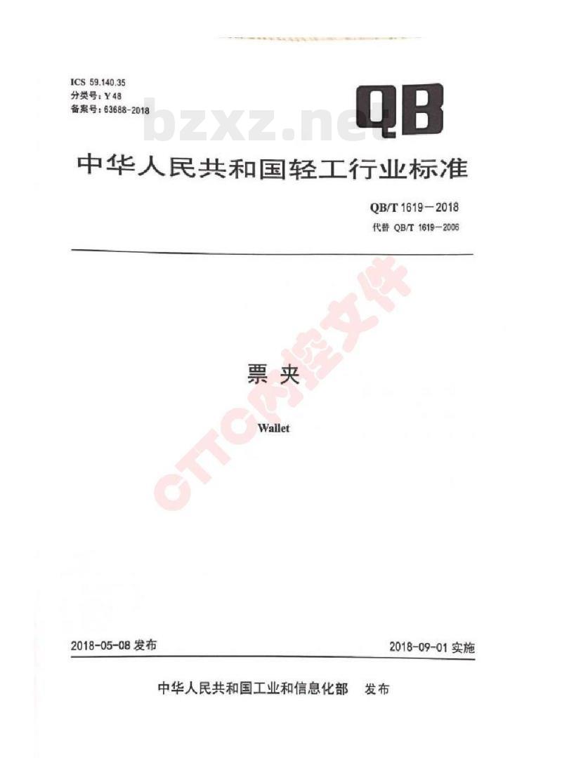 本标准按照GB/T1.1-2009给出的规则起草,本标准是对QB/T1619—2006《票夹》的修订。本标准与QB/T1619-2006相比,除编辑性修改外主要技术变化如下:调整了“范围”,扩大了标准的适用范围:增加了“原料和配件”的要求及试验方法QB/T1619-2018