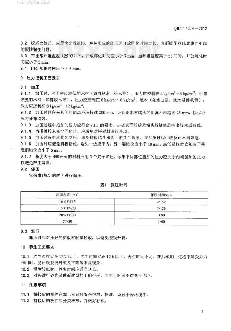 10.1养生温度宜在25℃以上,养生时间宜在12h以上。养生时间不足,在后续加工过程中当受外力作用时,易出现胶线开裂及下陷等不良现象。10.2温度较低时,养生时间应适当延长。10.3对将进行砂光及曲面成型加工的拼板,其养生时间不应低于24h。11注意事项免费标准bzxz.net