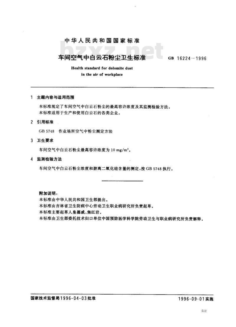 - GB 16224-1996 车间空气中白云石粉尘卫生标准