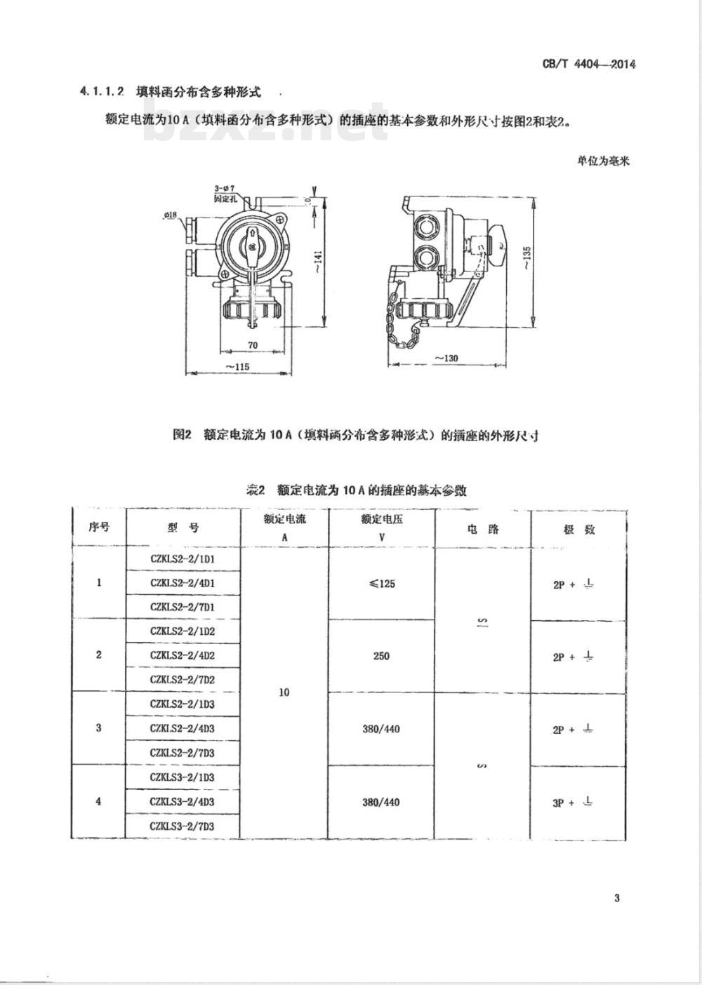 含两个填料函,分布在左、右两侧额定电流为10A(两填料函在下方),额定电压为250V的双极带接地销的插座标记为:插座CB/T4404—2014CZKLS2-2/D2额定电流为10A,额定电压为250V,左边带有二个填料函双极带接地销的插座标记为:插座CB/T4404--2014CZKLS2-2/4D2额定电流为16A,额定电压为250V,左、右各带有一个填料函带接地销的插座标记为:插座CB/T4404-2014CZKLS2-2/7I4额定电流为32A,额定电压为380/440V,右边带有二个填料函带接地销的插座标记为:开关插座CB/T4404—2014CZKLS3-2/5I55要求