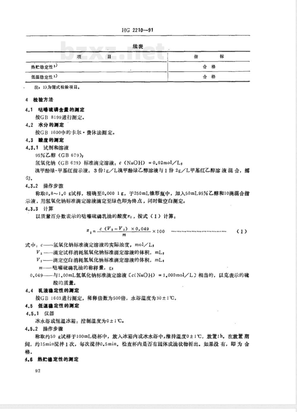 按GB1603进行测定,稀释倍数为500倍,水浴温度为30土1℃。4.5低温稳定性的测定