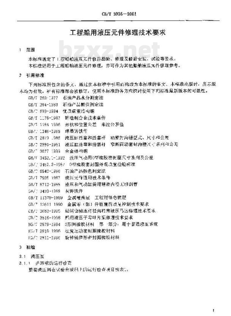 CB/T 3936适用于工程船舶液压元件修理,亦可作为其他船舶液压元件修理参考。