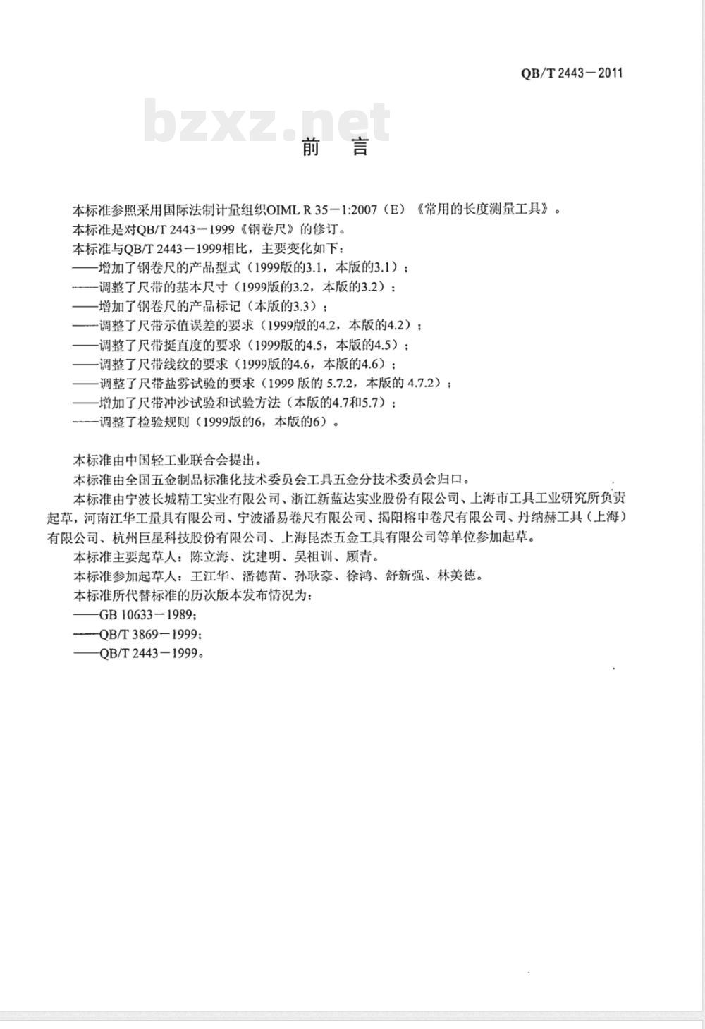 本标准参照采用国际法制计量组织OIMLR35一1:2007(E)《常用的长度测量工具》。本标准是对QB/T2443一1999《钢卷尺》的修订。本标准与QB/T2443一1999相比,主要变化如下:增加了钢卷尺的产品型式(1999版的3.1,本版的3.1);调整了尺带的基本尺寸(1999版的3.2,本版的3.2);增加了钢卷尺的产品标记(本版的3.3);一调整了尺带示值误差的要求(1999版的4.2,本版的4.2);调整了尺带挺直度的要求(1999版的4.5,本版的4.5);-调整了尺带线纹的要求(1999版的4.6,本版的4.6);调整了尺带盐雾试验的要求(1999版的5.7.2,本版的4.7.2);增加了尺带冲沙试验和试验方法(本版的4.7和5.7);调整了检验规则(1999版的6,本版的6)。本标准由中国轻工业联合会提出。本标准由全国五金制品标准化技术委员会工具五金分技术委员会归口。本标准由宁波长城精工实业有限公司、浙江新蓝达实业股份有限公司、上海市工具工业研究所负责起草,河南江华工量具有限公司、宁波潘易卷尺有限公司、揭阳榕中卷尺有限公司、丹纳赫工具(上海)有限公司、杭州巨星科技股份有限公司、上海昆杰五金工具有限公司等单位参加起草。本标准主要起草人:陈立海、沈建明、吴祖训、顾青。本标准参加起草人:王江华、潘德苗、孙耿豪、徐鸿、舒新强、林美德。本标准所代替标准的历次版本发布情况为:GB10633-1989;
