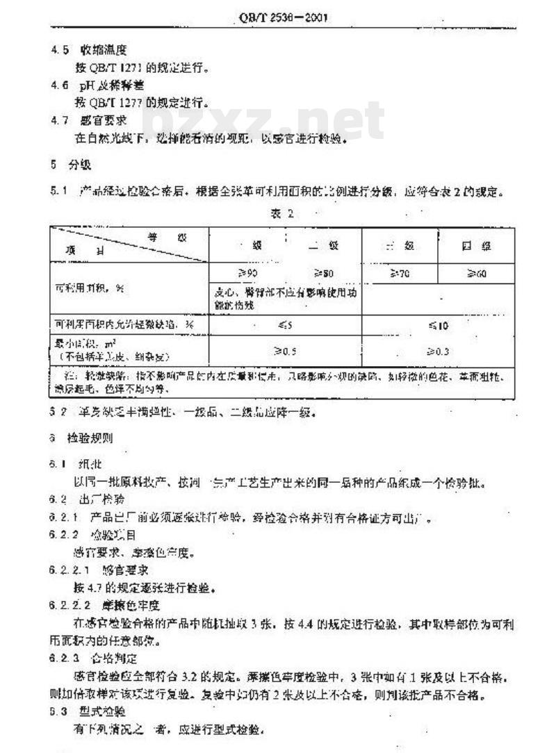 QB/T 2536规定了毛革绵羊皮的技术要求、试验方法、分级、检验规则和标志、包装、运输、贮存。
