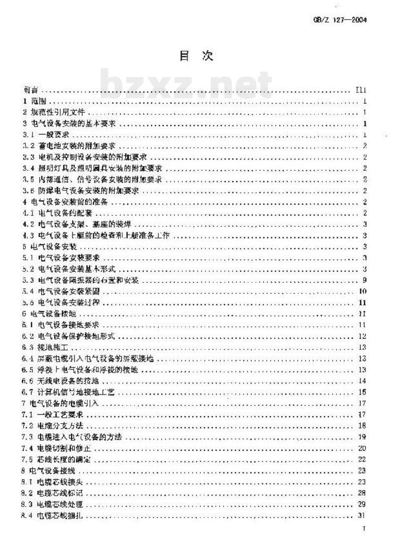 CB/Z 127规定了潜艇电气设备(以下简称电气设备),安装的基本要求;网装前的准备、安装;接地、电缆引入、接线和热缩套管的施工等工艺。