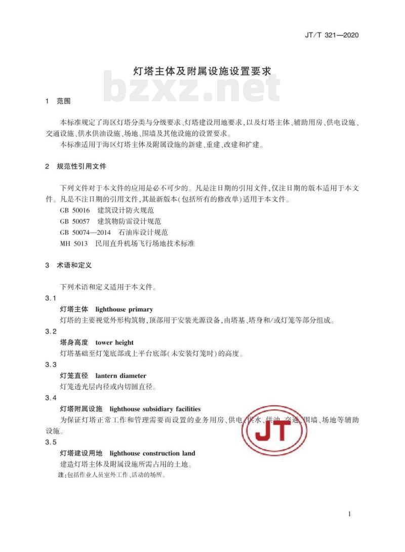 JT/T 321适用于海区灯塔主体及附属设施的新建,重建、改建和扩建。