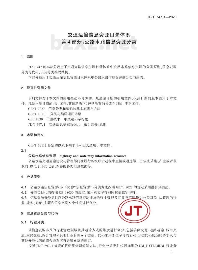 - JT/T 747.4-2020 交通运输信息资源目录体系第4部分:公路水路信息资源分类