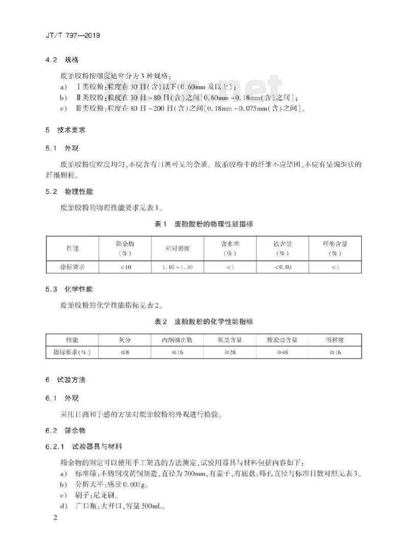 JT/T 797规定了路用废胎橡胶粉的分类和规格、技术要求、试验方法、检验规则、以及标志、包装、运输和储存的要求。