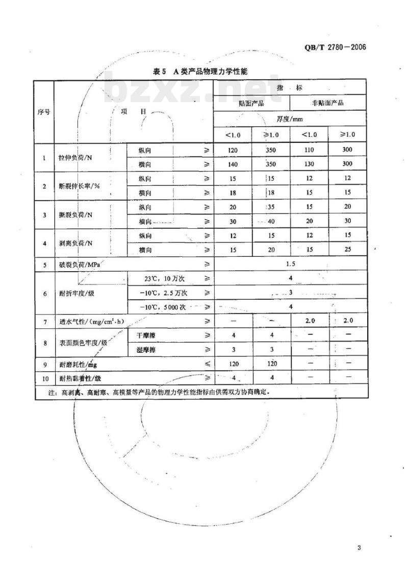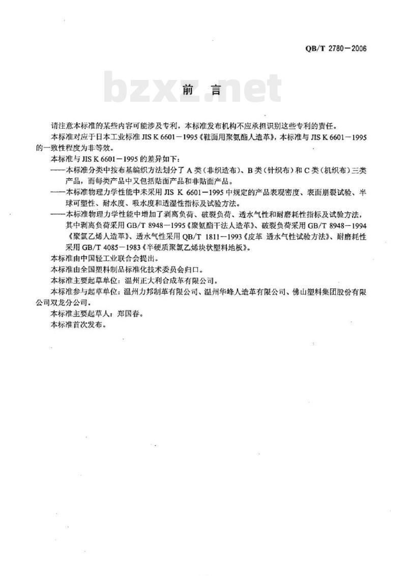 本标准与JISK6601—1995的差异如下:-本标准分类中按布基编织方法划分了A类(非织造布)、B类(针织布)和C类(机织布)三类产品,而每类产品中又包括贴面产品和非贴面产品。一本标准物理力学性能中未采用JISK6601一1995中规定的产品表观密度、表面崩裂试验、半球可塑性、耐水度、吸水度和透湿性指标及试验方法。本标准物理力学性能中增加了剥离负荷、破裂负荷、透水气性和耐磨耗性指标及试验方法,其中剥离负荷采用GB/T8948—1995《聚氨酯干法人造革》、破裂负荷采用GB/T8948—1994《聚氯乙烯人造革》、透水气性采用QB/T1811-1993《皮革透水气性试验方法》、耐磨耗性采用GB/T4085一1983《半硬质聚氯乙烯块状塑料地板》。本标准由中国轻工业联合会提出。本标准由全国塑料制品标准化技术委员会归口。本标准主要起草单位:温州正大利合成革有限公司。本标准参与起草单位:温州力邦制革有限公司、温州华峰人造革有限公司、佛山塑料集团股份有限公司双龙分公司。