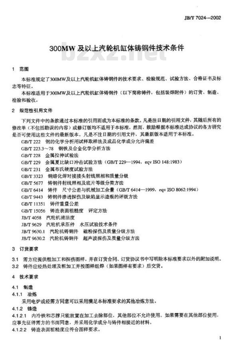 本标准适用于300MW及以上汽轮机缸体铸钢件(以下简称铸件,包括装焊附件)的订货、制造、检验和验收。