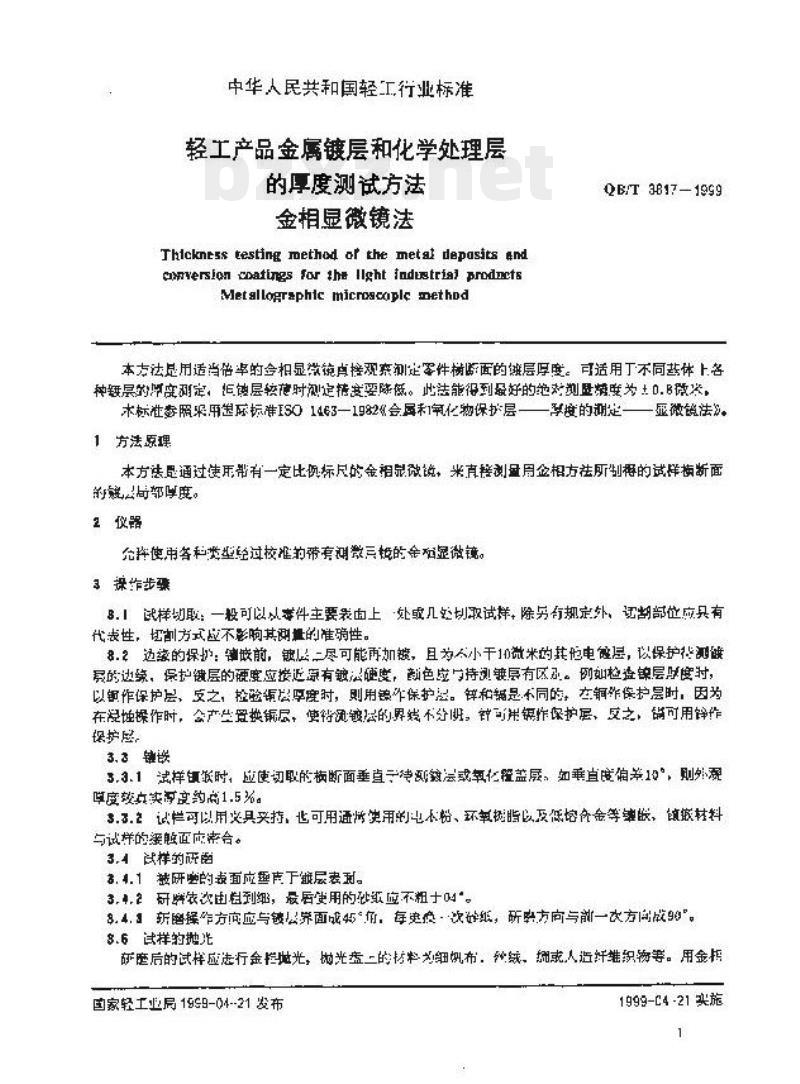 QB/T 3817-1999.Thickness testing method of the metal deposits andconversion coatings for the !ightindustriai products Metallographlc microscopic method