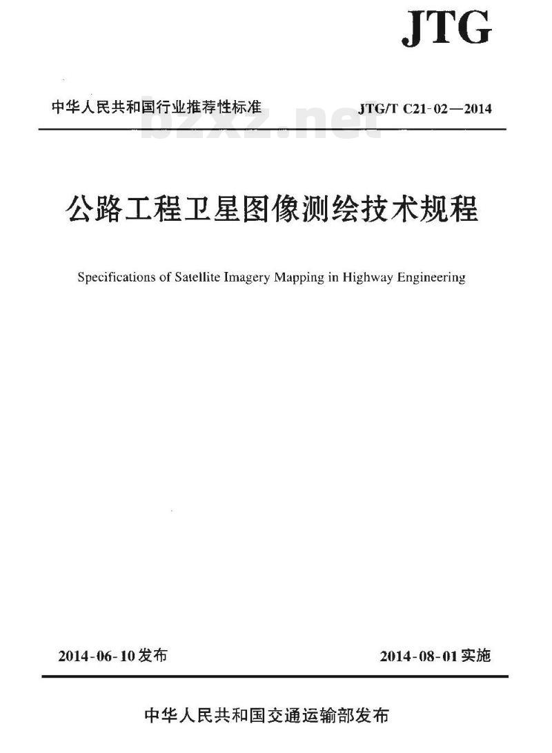 交通运输部关于发布《公路工程卫星图像测绘技术规程》的公告现发布《公路工程卫星图像测绘技术规程》(JTG/TC21-02一2014)作为公路工程行业推荐性标准,自2014年8月1日起施行。《公路工程卫星图像测绘技术规程》(JTC/TC21-02一2014)的管理权和解释权归交通运输部,日常解释和管理工作由主编单位中交第二公路勘察设计研究院有限公司负责: