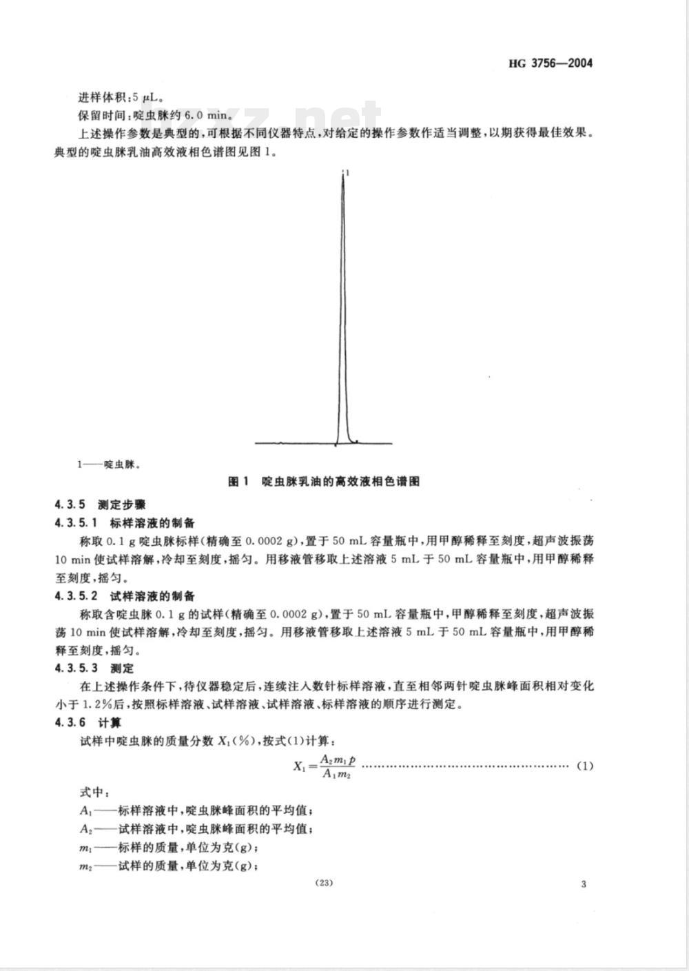 在上述操作条件下,待仪器稳定后,连续注入数针标样溶液,直至相邻两针啶虫峰面积相对变化小于1.2%后,按照标样溶液、试样溶液、试样溶液、标样溶液的顺序进行测定。4.3.6计算