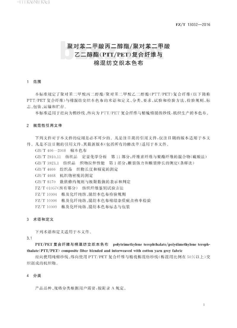 FZ/T 13032适用于经向为棉纱线.纬向为PTT/PET复合纤维与精梳棉混纺纱线,机织生产的本色布。