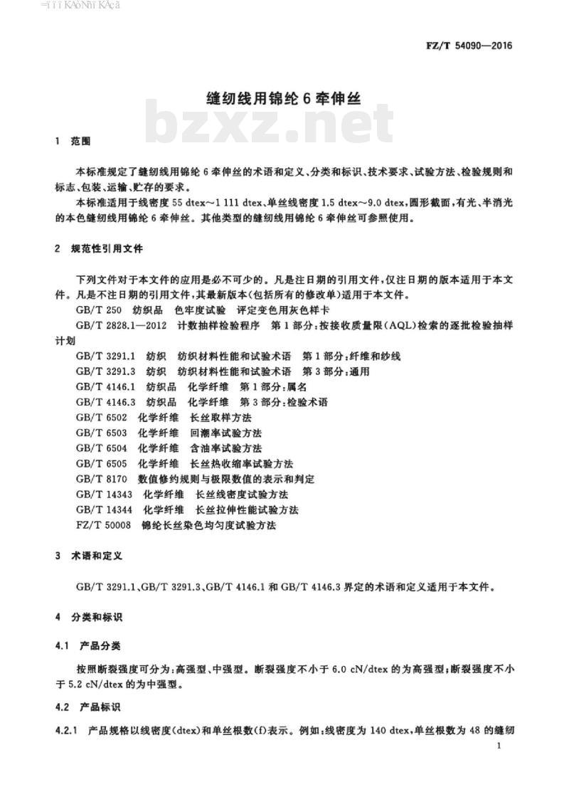 FZ/T 54090适用于线密度55 dtex~1 111 dtex.单丝线密度1.5 dtex~9.0 dtex,圆形截面,有光.半消光的本色缝纫线用锦纶6牵伸丝。其他类型的睫纫线用锦纶6牵伸丝可参照使用。