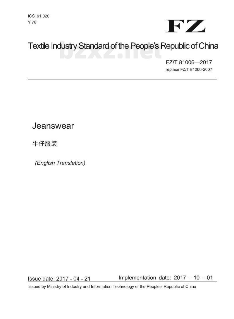 SAC/TC 219 is in charge of this English translation. In case of any doubt about the contents ofEnglish translation, the Chinese original shall be considered authoritative.This standard is drafted in accordance with the rules given in the GB/T 1.1-2009.This standard replaces the FZ/T 81006-2007 Jeanswear in whole. The following deviations havebeenmadewithrespecttotheFZ/T81006-2007:revised the scope of this standard (see Clause 1, Clause 1 in 2007 edition):-added and revised the normative reference (see Clause 2, Clause 2 in 2007 edition):-revised the English terms of unwashed jeanswear and washed jeanswear, deleted the terms anddefinitions of regular jeanswear and colour jeanswear (see Clause 3, Clause 3 in 2007 edition):-added the rules of instructions for use (see 4.1, 4.1 in 2007 edition);revised the requirements of raw materials: revised the requirements of shell fabric and liningadded the requirements of \trimming\ and \cords and drawstrings, elastic band\ in accessories; ancrevised the requirements for buttons, decorative buttons,zippers and other accessories (see 4.3, 4.3in2007edition)