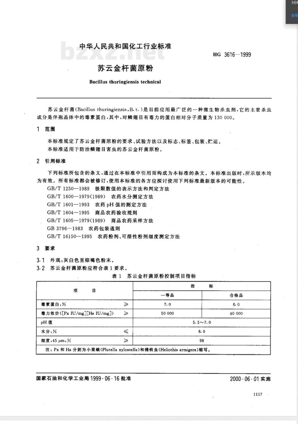 本标准是根据我国以往制定的苏云金杆菌企业标准等有关材料,结合我国实际情况而制定的,本标准对苏云金杆菌原粉的要求、试验方法、抽样以及包装、运输等作了具体要求和规定,从而为苏云金杆菌生产提供了统一的技术依据。本标准的附录A是提示的附录,附录B是标准的附录。本标准由中华人民共和国原化学工业部技术监督司提出。本标准由化学工业部沈阳化工研究院归口。本标准主要起草单位:中国农业大学应用化学系。本标准参加起草单位:湖北省生物农药工程研究开发中心、济南科贝尔生物工程有限公司。本标准主要起草人:刘丰茂、王开梅、钱传范、钟连胜、赵欣昕、王绮文。1156