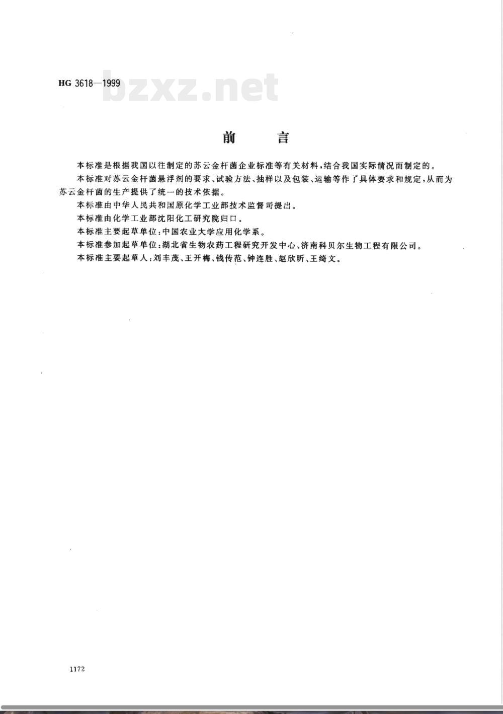 本标准是根据我国以往制定的苏云金杆菌企业标准等有关材料,结合我国实际情况而制定的。本标准对苏云金杆菌悬浮剂的要求、试验方法、抽样以及包装、运输等作了具体要求和规定,从而为苏云金杆菌的生产提供了统一的技术依据。本标准由中华人民共和国原化学工业部技术监督司提出。本标准由化学工业部沈阳化工研究院归口。本标推主要起草单位:中国农业大学应用化学系。本标准参加起草单位:湖北省生物农药工程研究开发中心、济南科贝尔生物工程有限公司。本标准主要起草人:刘丰茂、王开梅、钱传范、钟连胜、赵欣昕、王绮文。1172