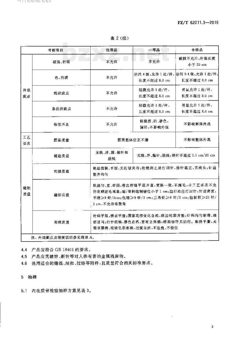 针码平服,绣面平整;图案花型变化自然,绣边轮廊齐整针码均勾细薄,细密适当;行针流畅,掺色自然,富有立体感绣面洁净无新污。贴绣平服,无明显漏绣,喷绣色彩准谁确,过渡自然,不重,不错位注:外观囊点及程度说明参见附录 A。4.4产品应符合GB18401的要求。4.5产品应无缝针、断针等对人体有害的金属残留物。4.6选用适合的缝线、纽扣、拉链等附件,且质量符合相关标催要求。5抽样