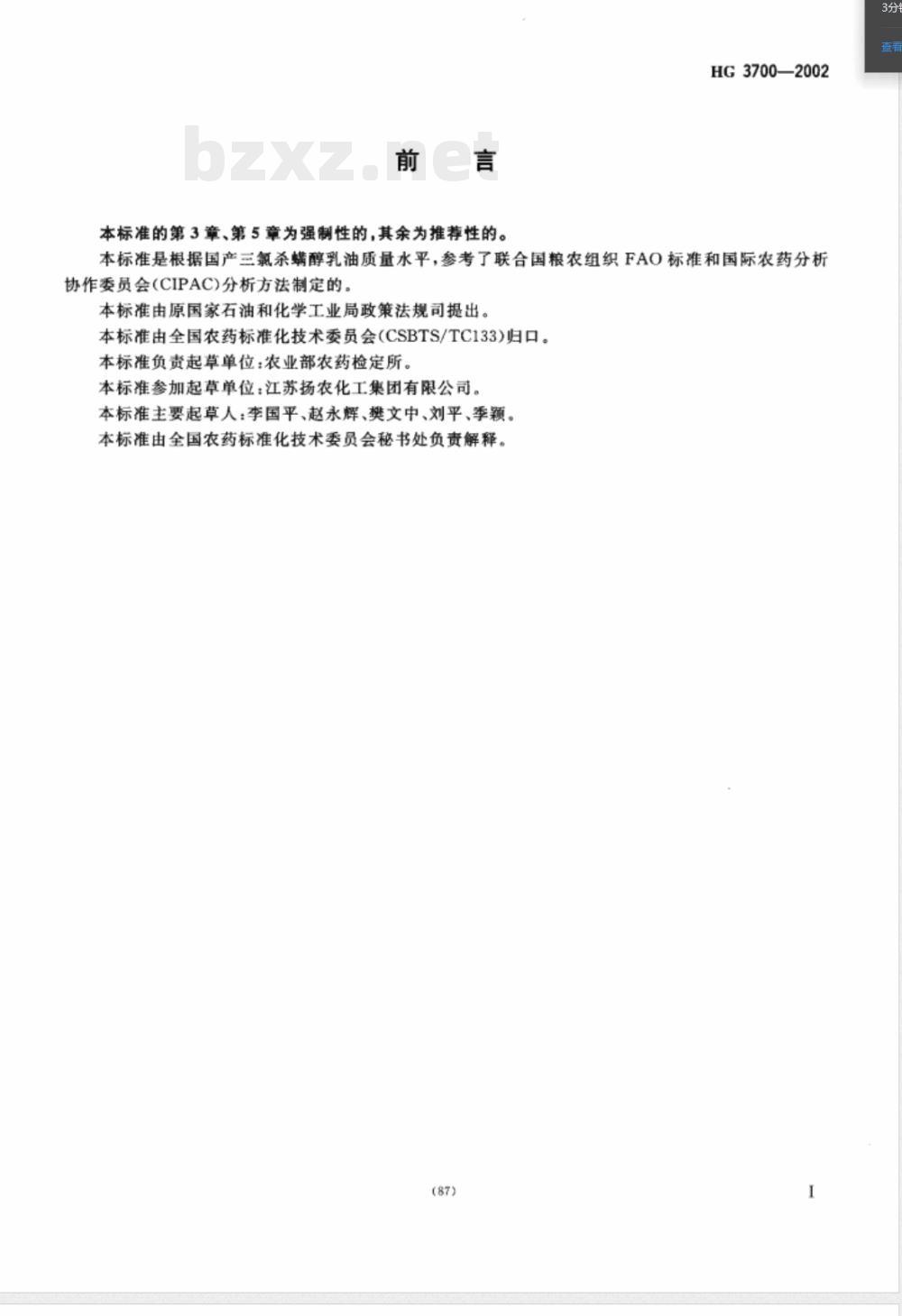 本标准是根据国产三氟杀螨醇乳油质量水平,参考了联合国粮农组织FAO标准和国际农药分析协作委员会(CIPAC)分析方法制定的。本标准由原国家石油和化学工业局政策法规司提出。本标准由全国农药标准化技术委员会(CSBTS/TC133)归口。本标准负责起草单位:农业部农药检定所。本标准参加起草单位:江苏扬农化工集团有限公司。本标准主要起草人:李国平、赵永辉、樊文中、刘平、季颗。本标准由全国农药标准化技术委员会秘书处负责解释。(87)