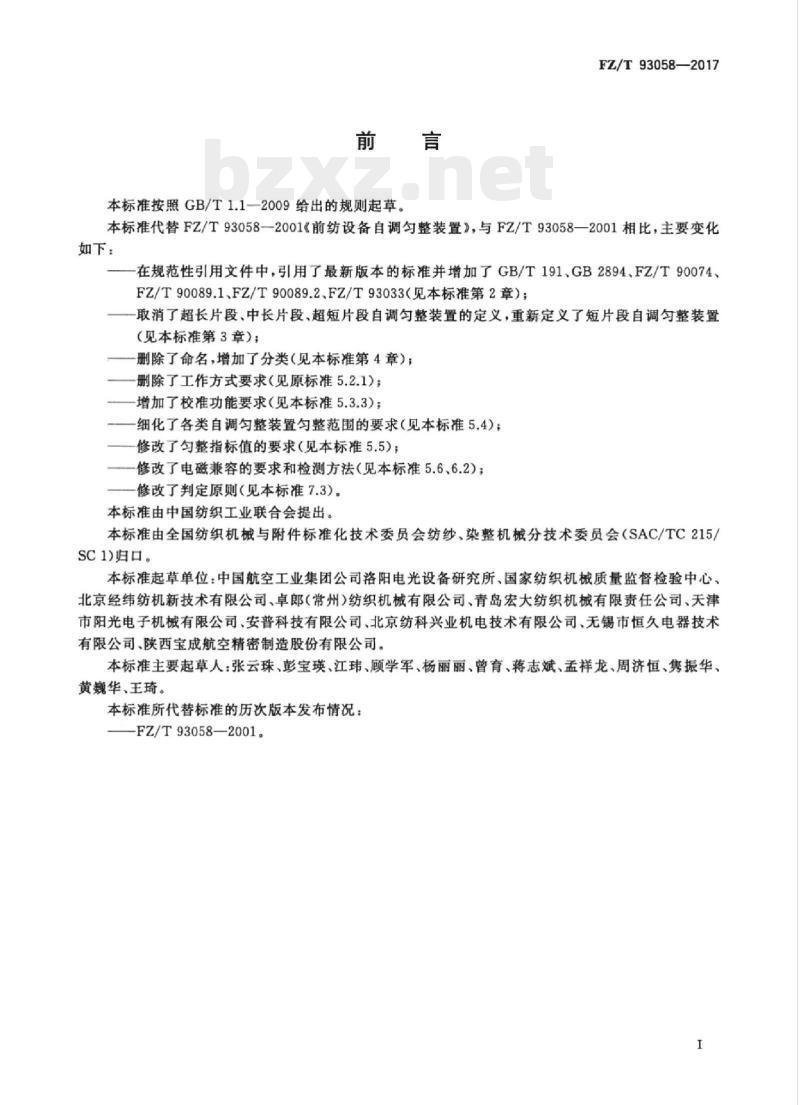 FZ/T 93058适用于清花成卷机、梳棉机.并条机等前纺设备自调匀整装置(以下简称自调匀整装置)。