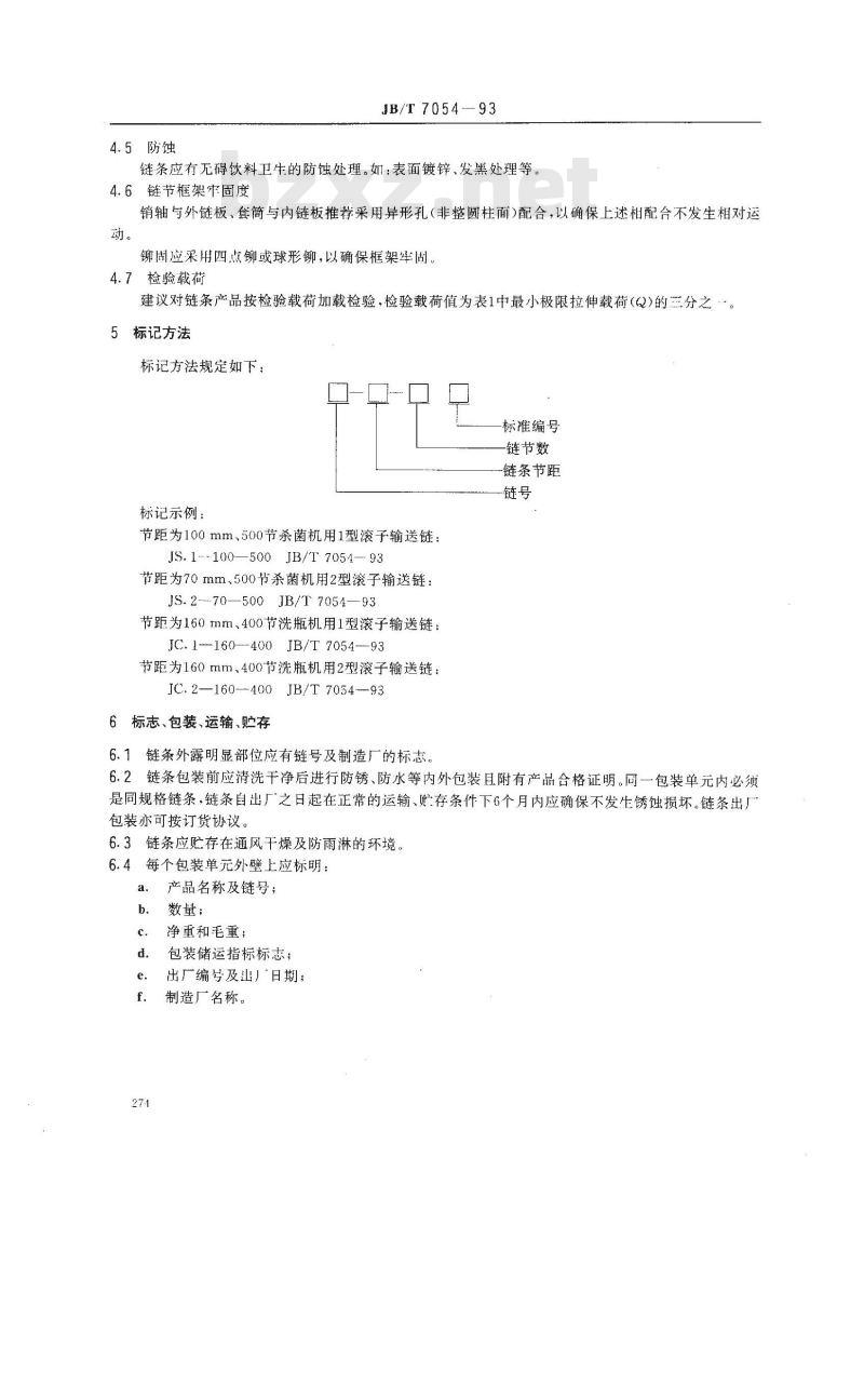 6.1链条外露明显部位应有链号及制造厂的标志。6.2链条包装前应清洗干净后进行防锈、防水等内外包装且附有产品合格证明。同一包装单元内必须是同规格链条,链条自出厂之日起在正常的运输、贮存条件下6个月内应确保不发生锈蚀损坏。链条出厂包装亦可按订货协议。