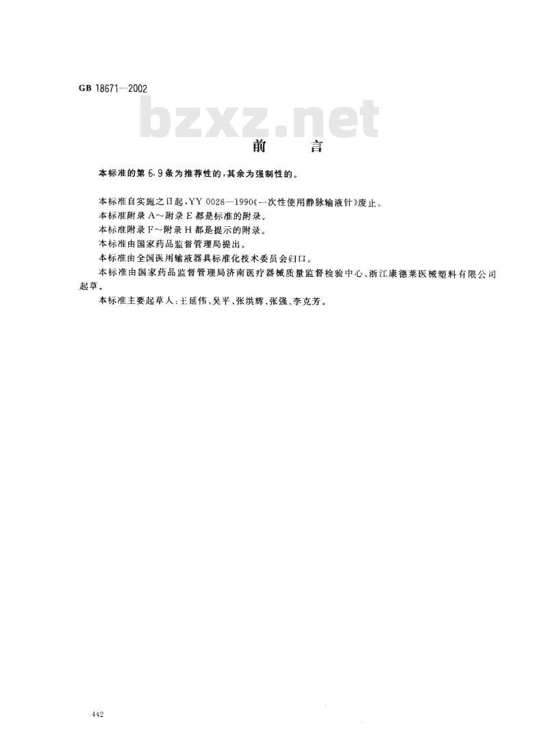 本标准自实施之日起,YY0028—1990《一次性使用静脉输液针》废止。本标准附录A~附录E都是标准的附录。本标推附录F~附录H都是提示的附录。本标准由国家药品监督管理局提出。本标准由全国医用输液器具标准化技术委员会归口。本标准由国家药品监督管理局济南医疗器械质量监督检验中心、浙江康德莱医械塑料有限公司起草。