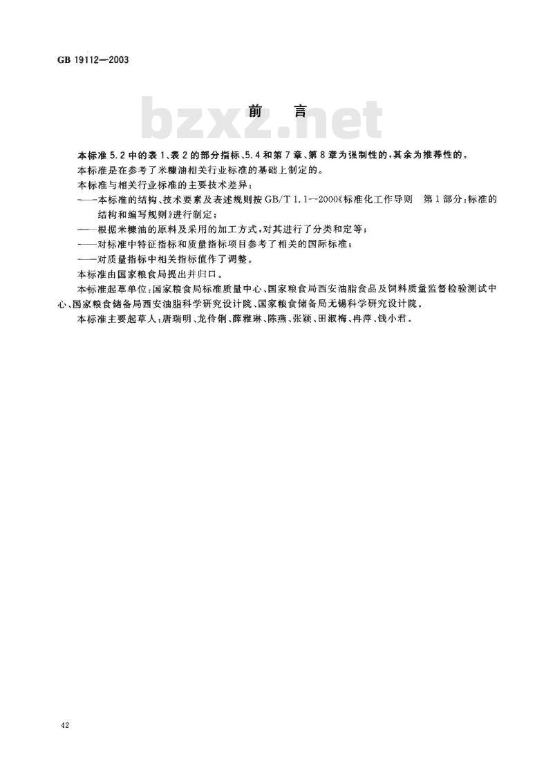 一一根据米糠油的原料及采用的加工方式,对其进行了分类和定等;一对标准中特征指标和质量指标项目参考了相关的国际标准;一对质量指标中相关指标值作了调整。本标准由国家粮食局提出并归口。本标准起草单位:国家粮食局标准质量中心、国家粮食局西安油脂食品及饲料质量监督检验测试中心、国家粮食储备局西安油脂科学研究设计院、国家粮食储备局无锡科学研究设计院本标准主要起草人:唐瑞明、龙伶俐、薛雅琳、陈燕、张颖、田淑梅、冉萍、钱小君。42