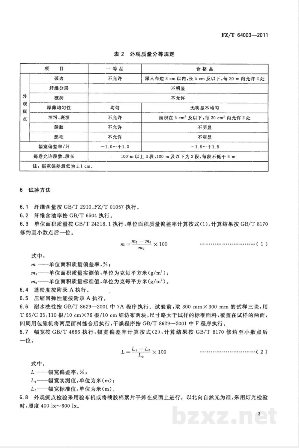 单位面积质量实测值,单位为克每平方米(g/m2);一单位面积质量标准值,单位为克每平方米(g/m2)。6.4蓬松度按附录A执行。