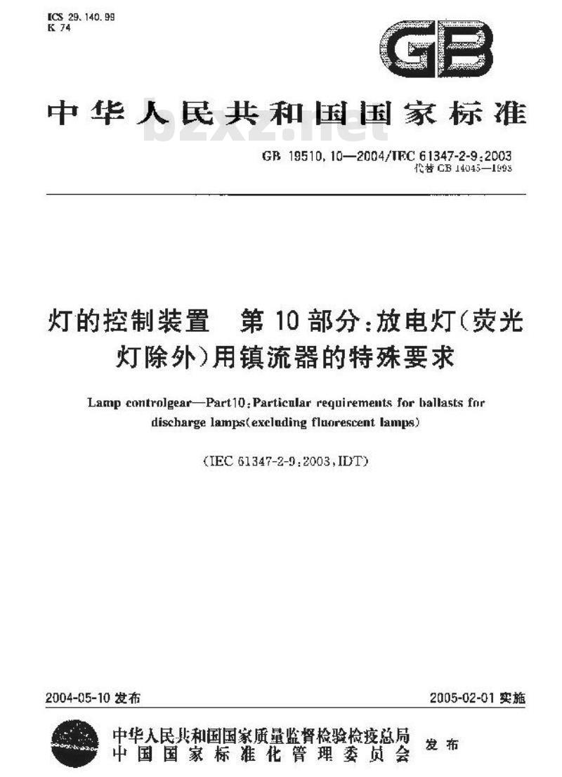 - GB 19510.10-2004 灯的控制装置 第10部分:放电灯(荧光灯除外)用镇流器的特殊要求