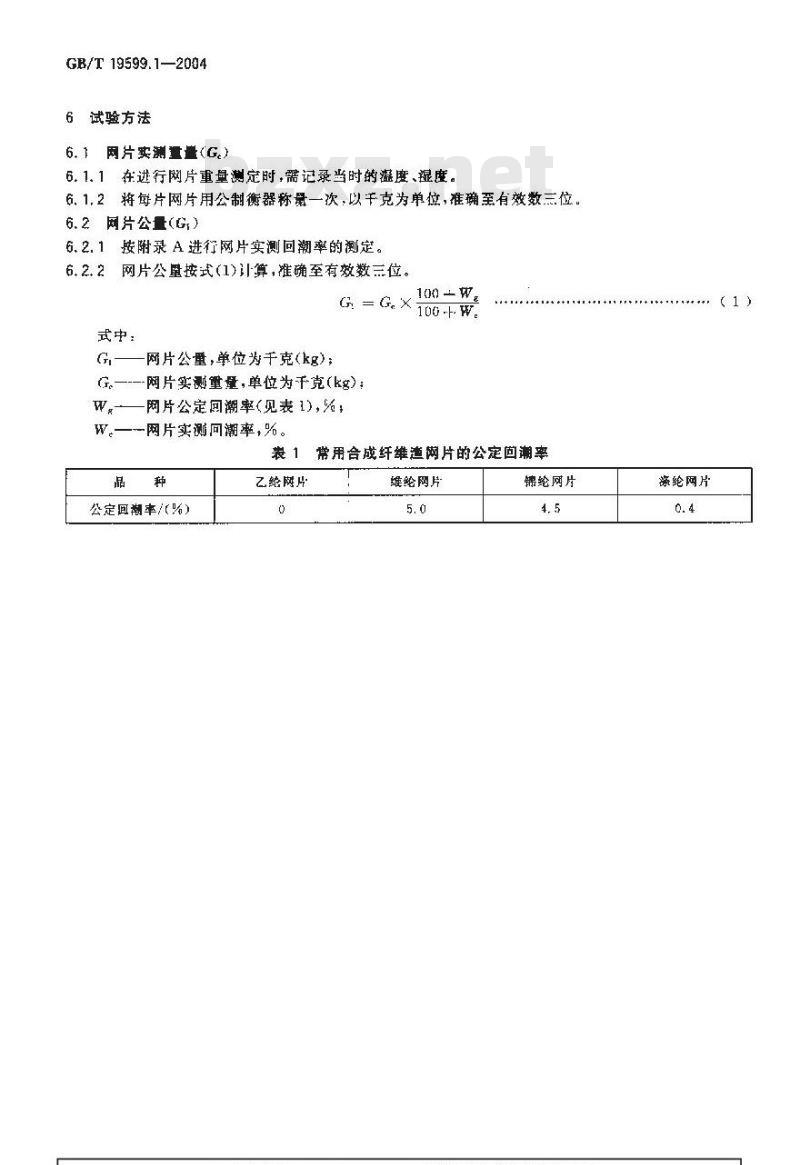 GB/T 19599的本部分规定了网片实测重量和网片公量的测定。本部分适用于渔网片的网片重量的测定。 GB/T 19599.1-2004 合成纤维渔网片试验方法 网片重量 GB/T19599.1-2004