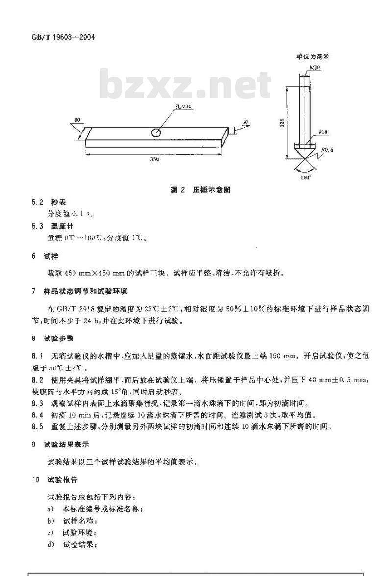 8.2使用夹其将试样绷平,而后放在试验仪上端。将压锤置于样品中心处,并压下 40 mm土0.5 1nml使膜面与水平方向约成15°角,同时启动秒表。8.3观察试样内表面上水滴聚集情况,记录第一滴水珠滴下的时间,即为初滴时间。8.4初滴10min后,记录连续10滴水珠滴下所需的时间。连续测试3次,取平均值。8.5重复上述步骤,分别测量另外两块试样的初滴时间和连续10滴水珠滴下所需的时间。9试验结果表示