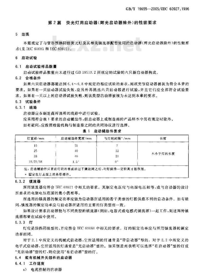 GB/T 19655—2005/IEC 609271996第2篇荧光灯用启动器(辉光启动器除外)的性能要求本篇规定了与管形预热阳极荧光灯及其相关镇流器配套使用的启动器(辉光启动器除外)的性能要求(见IEC60081和1EC60921)