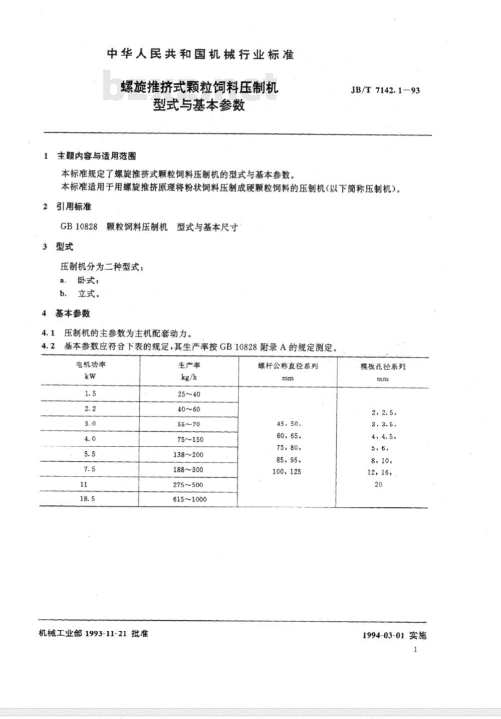 - JB/T 7142.1-1993 螺旋推挤式颗粒饲料压制机 型式与基本参数