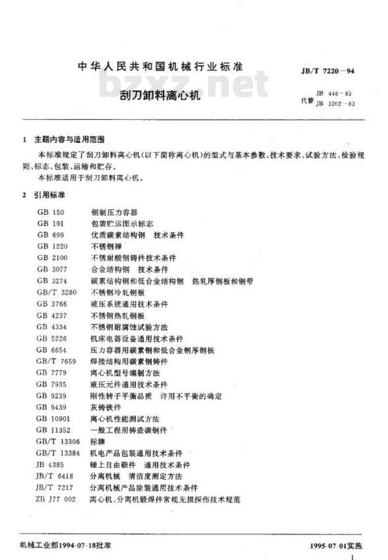 本标准代替JB 446-83和JB 3202-83二项标准。 本标准规定了刮刀卸料离心机的型式与基本参数、技术要求、试验方法、检验规则、标志、包装、运输和贮存。 本标准适用于刮刀卸料离心机。 JB/T 7220-1994 刮刀卸料离心机 JB/T7220-1994