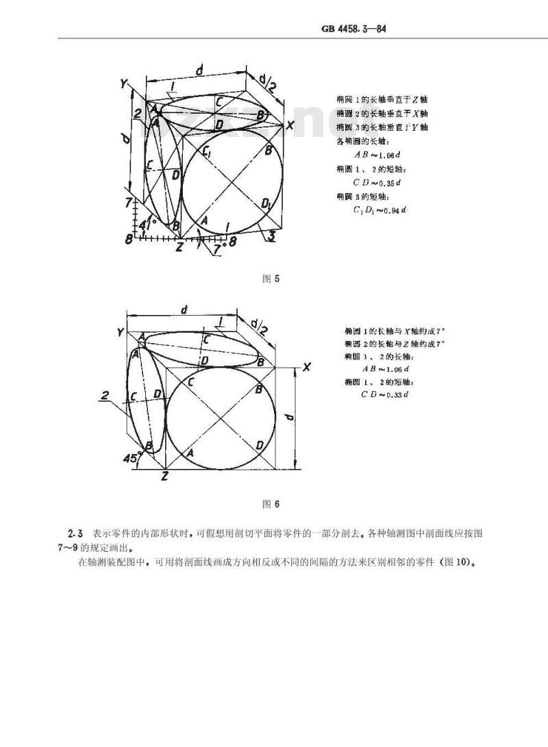 2.1轴测图中一般只画出可见部分,必要时才画出其不可见部分。2.2与各坐标平面平行的圆(如直径为&)在各种轴测图中分别投影为椭圆(斜二测中正面投影仍为圆)如图4~6所示。