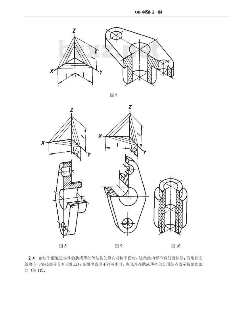 2.3表示零件的内部形状时,可假想用剖切平面将零件的一部分剖去。各种轴测图中剖面线应按图7~9的规定画出。
