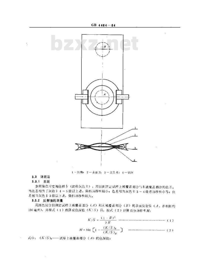 用测色仪分别测定试样上被覆盖部分(A)和木被覆盖部分(B)的表面反射(A、B相肌约100毫米),并按式(1)换算成色深值(K/S)后,按式(2)计算白分泳移率M:KS =