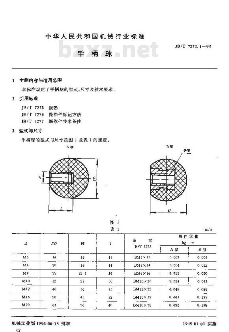 本标准代替GB 4141.11-84。本标准规定了手柄球的型式、尺寸及技术要求。 JB/T 7271.1-1994 手柄球 JB/T7271.1-1994