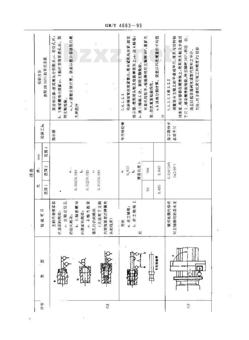 3.2机床精度检验前应参照JB2670第3.1条,谢整机床的安装水平。在床身导轨上放置专用桥板,其上放置水平仪,水平仪在纵向和横向的读数均不得超过0.04/1000。3.3本标准的检验项目顺序号,并不表示实际检验顺序。为了装拆检验工具和检验方使,可按任意次序进行检验,