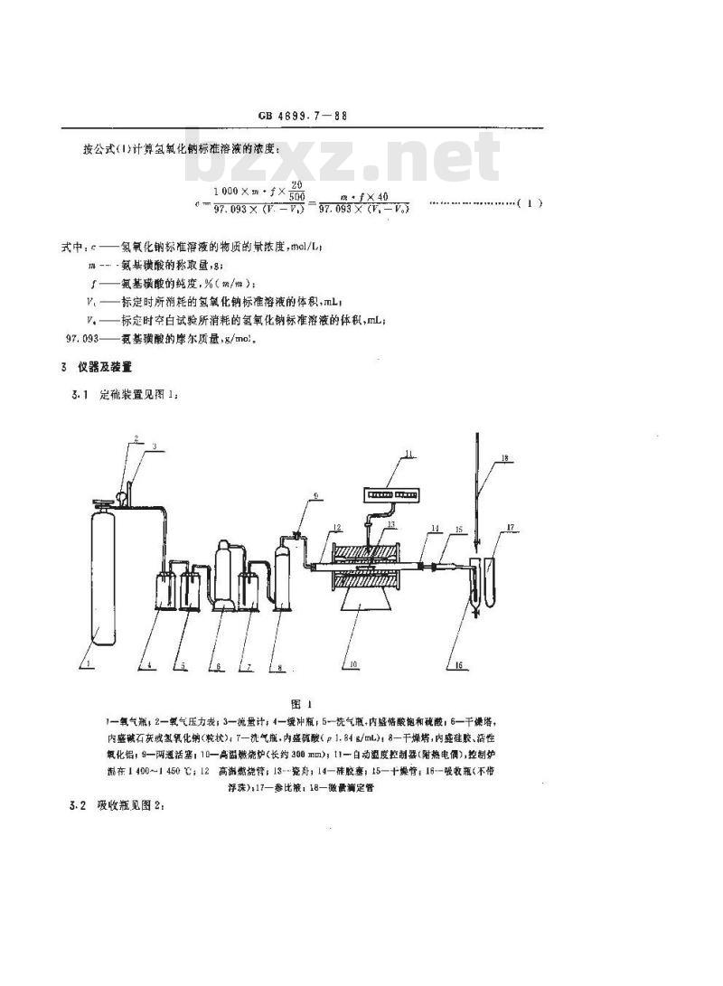 2.2高温燃烧管:×L,mm:20~24×6002.3瓷舟:预先在1400C的高温燃烧管中通氧均烧5min.冷却备用。2.4高纯铁:粉状.硫量小于0.0010%。2.5五载化二钒:碗量小于0.0010%。2.6硅胶、活性氧化铝或高氟酸镁。2.7碱石灰或氨氧化钠(粒状)。2.8铬酸饱和硫酸,于硫酸(g1.84g/mL)中加入重铬酸钾或无水饹酸使其饱和,使用上部澄清液。2.9吸收液:移取3.5mL过氧化氢(30%)用水稀释至1000mL.混句,2.10混合指示剂:称取0.1250g甲基红和0.0830g次甲基蓝用无水乙醇溶解并稀释至100mL。2.11氨基磺酸标准溶液:称取约0.100g(精确至0.1mg)预先在真空硫酸+燥器中干燥约48h、纯度大于99.90%的氨基磺酸(NHS0,H)于300ml烧杯中,用30mL水使之完全溶解,移入500mL棕色容量瓶中,以水稀释至刻度,混匀。2.12氢氧化钠标准溶液:c(Na0H)=0.005mol/L。2.12.1配制