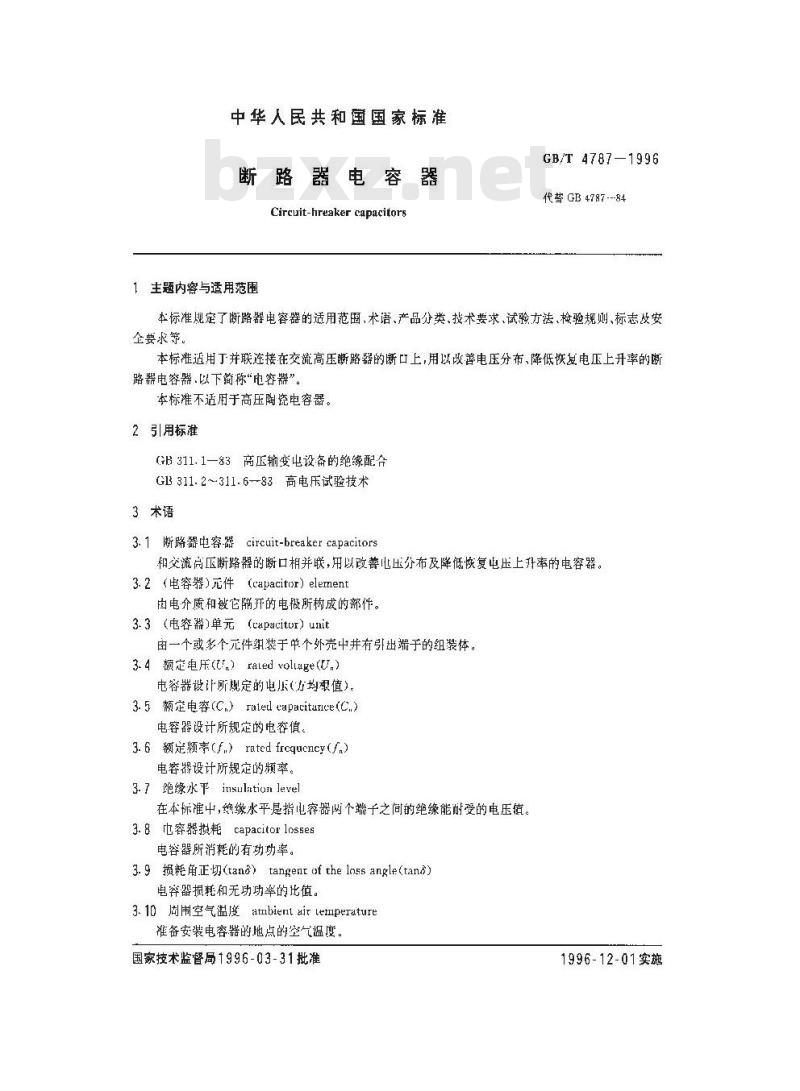 本标准定了断路器电容器的适用范围,术语、产品分类,技术要求,试验方法,检验规则、标志改安金要求等。