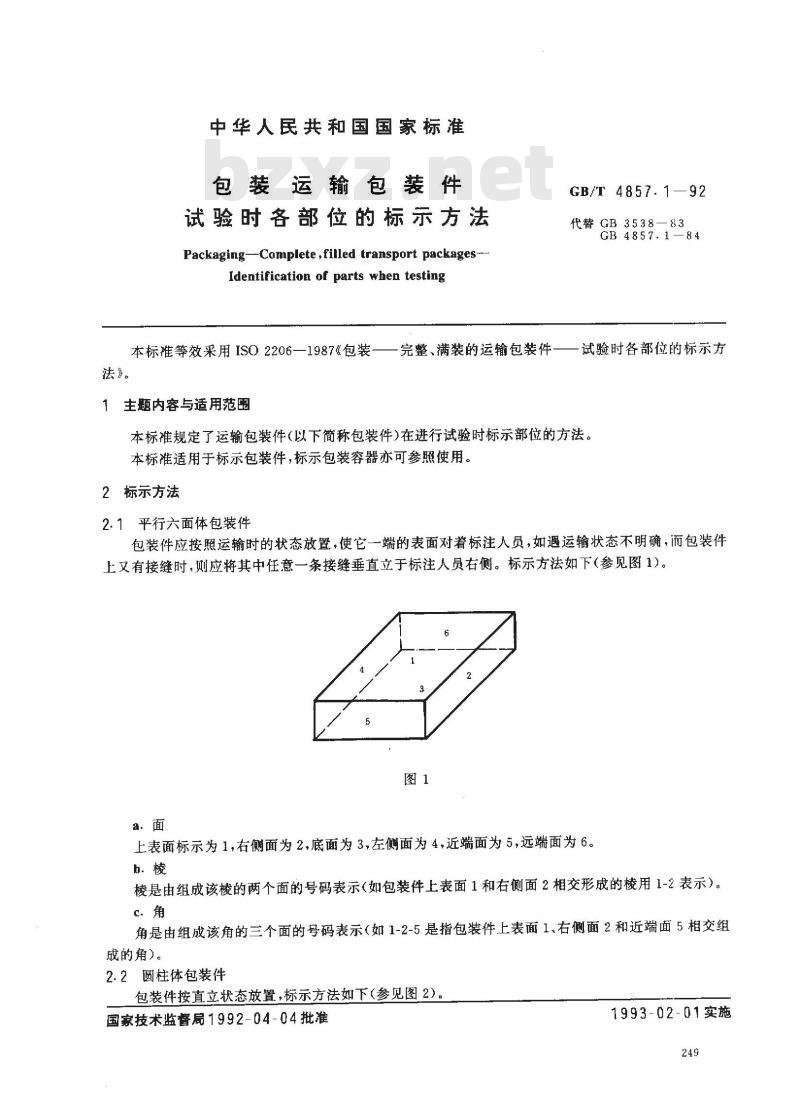- GB/T 4857.1-1992 包装运输包装件 试验时各部位的标志方法