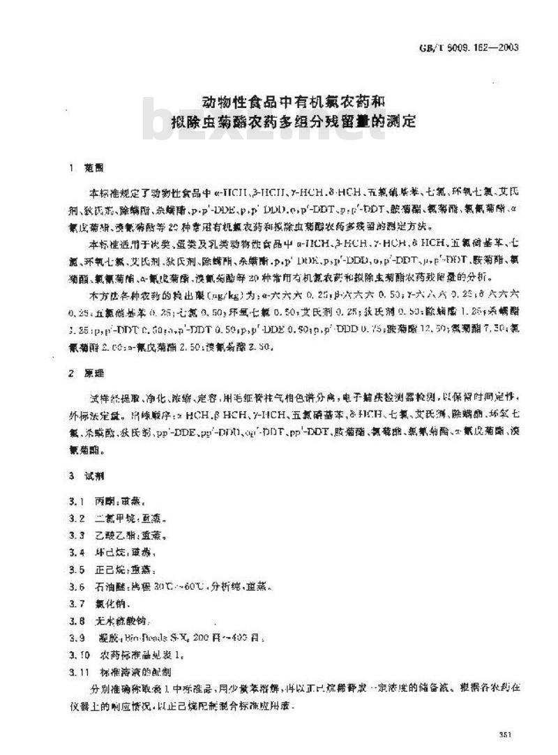 - GB/T 5009.162-2003 动物性食品中有机氯农药和拟除虫菊酯农药多组分残留量测定