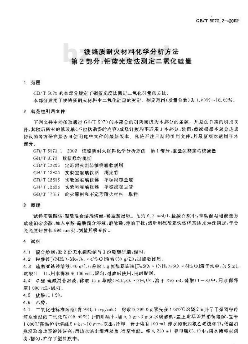 - GB/T 5070.2-2002 镁铬质耐火材料化学分析方法 第2部分: 钼蓝光度法测定二氧化硅量