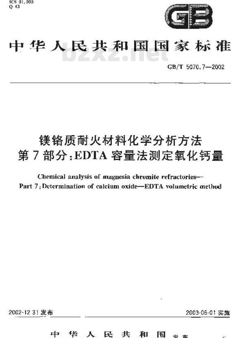 - GB/T 5070.7-2002 镁铬质耐火材料化学分析方法 第7部分: EDTA容量法测定氧化钙量
