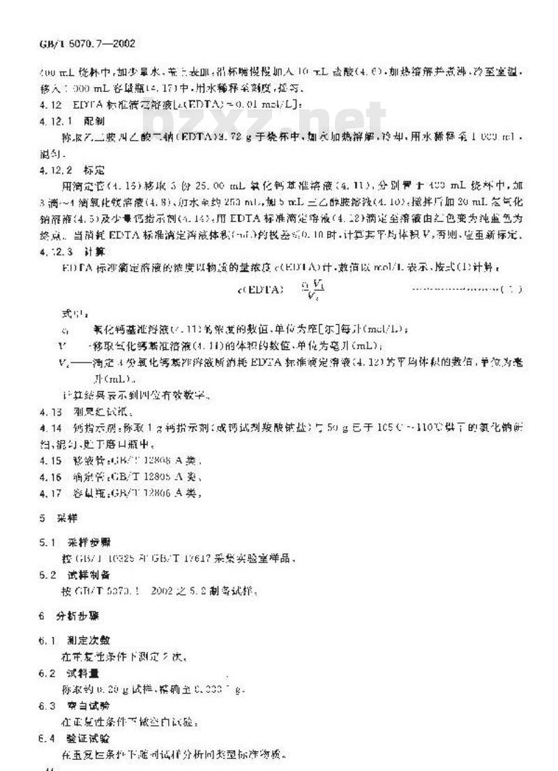 ——淘减液所消花A标准我完落教2闪位积的激直单代为老外:V滴定试液以消的EYTA你饰滴定率渡4.2)的体的数值单官为壶升(m)一以标准病定穿微的浓追的准通效值,拉为举[尔(]M()的你质量的效低单位为克每序尔(g1m1.M=E.791:—收试料的示量的数使.单位为克)7.2分价再为效先房至复必案件分折的你准物的分析的只与标准伯致,当坏润购成的分折代与标准值产不人于并充计关时:证样会析消有效,否则效7.3当所得试样它两个存效分扩识之益不主于表,所规定的允许些时.以共算代平均值件为反终分析绍采:否则,成拉对录A的见定进带追加分们和激期处亚。7.4斯得结应按5T817修约至需位小数,果要方供货合向或有关环准万有要求时,叫控步求的位数快约。