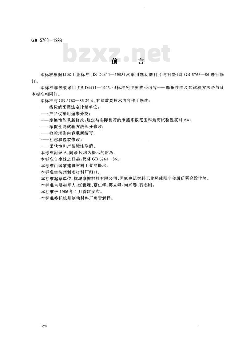 本标准根据日本工业标准JISD4411—1993《汽车用制动器衬片与衬垫》对GB5763一86进行修订。